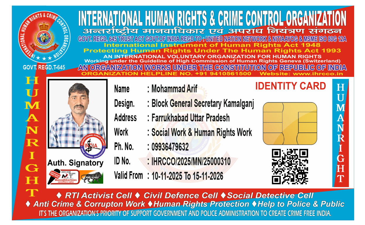अंतर्राष्ट्रीय मानवाधिकार एवं अपराध नियंत्रण संगठन के प्रदेश अध्यक्ष धीरज कुमार पांडे ने फर्रुखाबाद जनपद के कमालगंज ब्लॉक महामंत्री के रूप में मोहम्मद आरिफ जी को नियुक्त किया